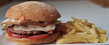 Hamburguesa casera con tomate, bacon, queso, cebolla y huevo frito